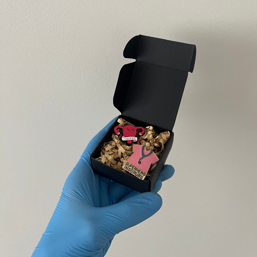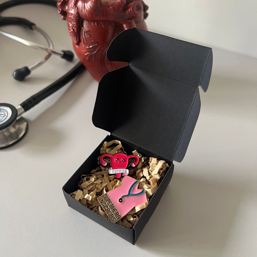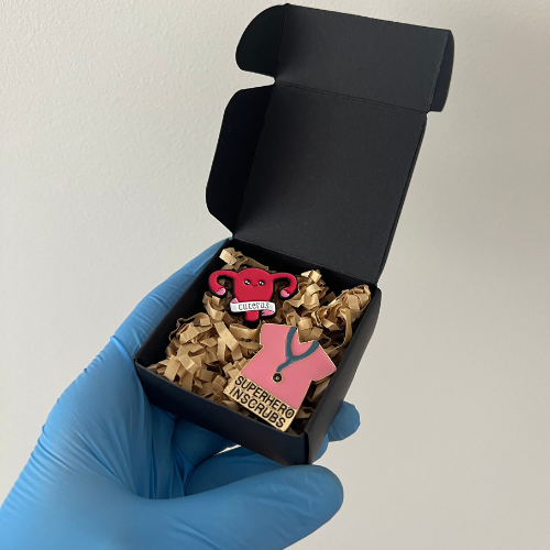 Gineco Set este combinația perfectă de accesorii care aduc un strop de personalitate și inspirație uniformei medicale, fiind dedicate profesioniștilor din domeniul ginecologiei. Setul include două broșe simbolice: Cuterus pin și Superhero in scrubs pink.